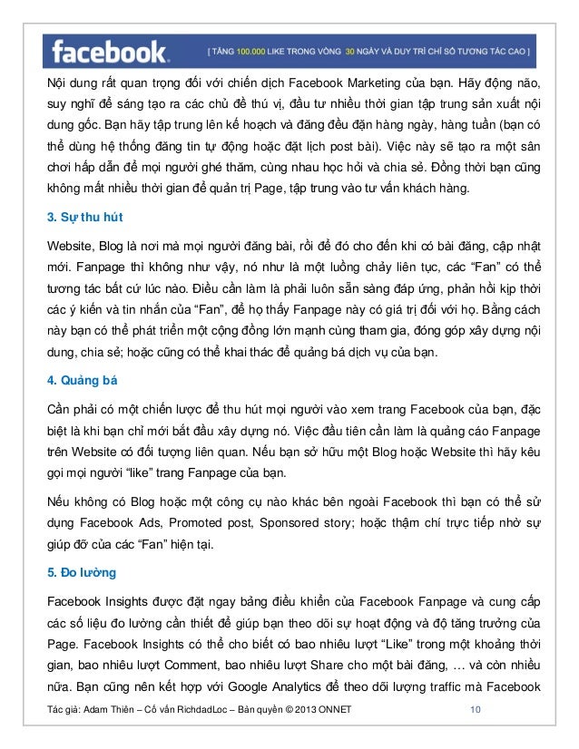 - 9. Tác giả: Adam Thiên – Cố vấn RichdadLoc – Bản quyền © 2013 ONNET 10 Nội dung rất quan trọng đối với chiến dịch Facebook Marketing của bạn. Hãy động não, suy nghĩ để sáng tạo ra các chủ đề thú vị, đầu tư nhiều thời gian tập trung sản xuất nội dung gốc. Bạn hãy tập trung lên kế hoạch và đăng đều đặn hàng ngày, hàng tuần (bạn có thể dùng hệ thống đăng tin tự động hoặc đặt lịch post bài). Việc này sẽ tạo ra một sân chơi hấp dẫn để mọi người ghé thăm, cùng nhau học hỏi và chia sẻ. Đồng thời bạn cũng không mất nhiều thời gian để quản trị Page, tập trung vào tư vấn khách hàng. 3. Sự thu hút Website, Blog là nơi mà mọi người đăng bài, rồi để đó cho đến khi có bài đăng, cập nhật mới. Fanpage thì không như vậy, nó như là một luồng chảy liên tục, các “Fan” có thể tương tác bất cứ lúc nào. Điều cần làm là phải luôn sẵn sàng đáp ứng, phản hồi kịp thời các ý kiến và tin nhắn của “Fan”, để họ thấy Fanpage này có giá trị đối với họ. Bằng cách này bạn có thể phát triển một cộng đồng lớn mạnh cùng tham gia, đóng góp xây dựng nội dung, chia sẻ; hoặc cũng có thể khai thác để quảng bá dịch vụ của bạn. 4. Quảng bá Cần phải có một chiến lược để thu hút mọi người vào xem trang Facebook của bạn, đặc biệt là khi bạn chỉ mới bắt đầu xây dựng nó. Việc đầu tiên cần làm là quảng cáo Fanpage trên Website có đối tượng liên quan. Nếu bạn sở hữu một Blog hoặc Website thì hãy kêu gọi mọi người “like” trang Fanpage của bạn. Nếu không có Blog hoặc một công cụ nào khác bên ngoài Facebook thì bạn có thể sử dụng Facebook Ads, Promoted post, Sponsored story; hoặc thậm chí trực tiếp nhờ sự giúp đỡ của các “Fan” hiện tại. 5. Đo lường Facebook Insights được đặt ngay bảng điều khiển của Facebook Fanpage và cung cấp các số liệu đo lường cần thiết để giúp bạn theo dõi sự hoạt động và độ tăng trưởng của Page. Facebook Insights có thể cho biết có bao nhiêu lượt “Like” trong một khoảng thời gian, bao nhiêu lượt Comment, bao nhiêu lượt Share cho một bài đăng, … và còn nhiều nữa. Bạn cũng nên kết hợp với Google Analytics để theo dõi lượng traffic mà Facebook