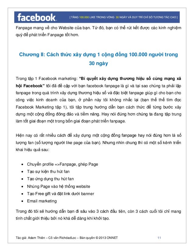 - 10. Tác giả: Adam Thiên – Cố vấn RichdadLoc – Bản quyền © 2013 ONNET 11 Fanpage mang về cho Website của bạn. Từ đó, bạn có thể rút kết được các kinh nghiệm quý để phát triển Fanpage tốt hơn. Chương II: Cách thức xây dựng 1 cộng đồng 100.000 người trong 30 ngày Trong tập 1 Facebook marketing: “Bí quyết xây dựng thương hiệu số cùng mạng xã hội Facebook” tôi đã đề cập với bạn facebook fanpage là gì và tại sao chúng ta phải lập fanpage trong quá trình xây dựng thương hiệu số và đặc biệt fanpage giúp gì cho bạn cho công việc kinh doanh của bạn, ở phần này tôi không nhắc lại (bạn thể thể tìm đọc Facebook Marketing tập 1), tôi tập trung hướng dẫn bạn cách thức để từng bước xây dựng một cộng đồng đông đảo và tiềm năng. Hay nói đúng hơn chúng ta đang tập trung làm tốt giai đoạn một trong bốn giai đoạn phát triển fanpage. Hiện nay có rất nhiều cách để xây dựng một cộng đồng fanpage hay nói đúng hơn là số lượng fan (số lượng người like page của bạn). Nhưng nhìn chung thì có một số kênh triển khai hiệu quả sau: Chuyển profile =>Fanpage, ghép Page Tạo sự kiện thu hút fan Tạo ứng dụng thu hút fan Nhúng Page vào hệ thống website Tạo Free gift và đặt link dưới banner Email marketing Trong đó tôi sẽ hướng dẫn bạn đi sâu vào 3 cách đầu tiên, còn 3 cách cuối tôi chỉ mang tính chất giới thiệu bởi nó khá dễ dàng khi khởi tạo.