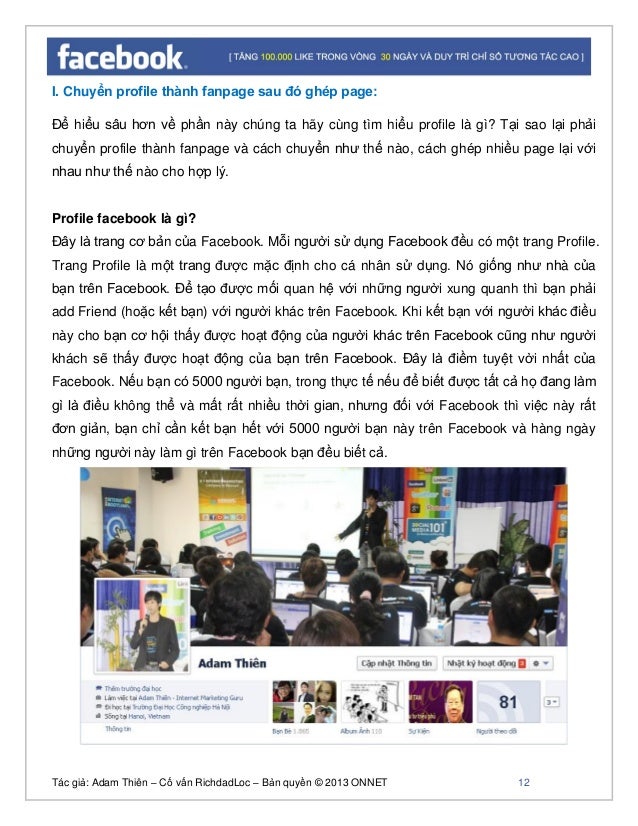 - 11. Tác giả: Adam Thiên – Cố vấn RichdadLoc – Bản quyền © 2013 ONNET 12 I. Chuyển profile thành fanpage sau đó ghép page: Để hiểu sâu hơn về phần này chúng ta hãy cùng tìm hiểu profile là gì? Tại sao lại phải chuyển profile thành fanpage và cách chuyển như thế nào, cách ghép nhiều page lại với nhau như thế nào cho hợp lý. Profile facebook là gì? Đây là trang cơ bản của Facebook. Mỗi người sử dụng Facebook đều có một trang Profile. Trang Profile là một trang được mặc định cho cá nhân sử dụng. Nó giống như nhà của bạn trên Facebook. Để tạo được mối quan hệ với những người xung quanh thì bạn phải add Friend (hoặc kết bạn) với người khác trên Facebook. Khi kết bạn với người khác điều này cho bạn cơ hội thấy được hoạt động của người khác trên Facebook cũng như người khách sẽ thấy được hoạt động của bạn trên Facebook. Đây là điềm tuyệt vời nhất của Facebook. Nếu bạn có 5000 người bạn, trong thực tế nếu để biết được tất cả họ đang làm gì là điều không thể và mất rất nhiều thời gian, nhưng đối với Facebook thì việc này rất đơn giản, bạn chỉ cần kết bạn hết với 5000 người bạn này trên Facebook và hàng ngày những người này làm gì trên Facebook bạn đều biết cả.