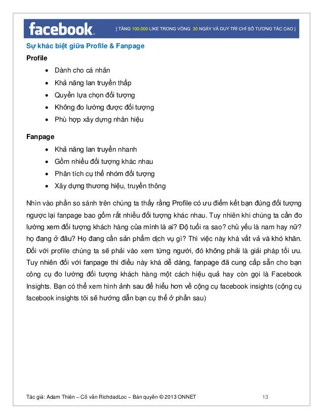 - 12. Tác giả: Adam Thiên – Cố vấn RichdadLoc – Bản quyền © 2013 ONNET 13 Sự khác biệt giữa Profile & Fanpage Profile Dành cho cá nhân Khả năng lan truyền thấp Quyền lựa chọn đối tượng Không đo lường được đối tượng Phù hợp xây dựng nhân hiệu Fanpage Khả năng lan truyền nhanh Gồm nhiều đối tượng khác nhau Phân tích cụ thể nhóm đối tượng Xây dựng thương hiệu, truyền thông Nhìn vào phần so sánh trên chúng ta thấy rằng Profile có ưu điểm kết bạn đúng đối tượng ngược lại fanpage bao gồm rất nhiều đối tượng khác nhau. Tuy nhiên khi chúng ta cần đo lường xem đối tượng khách hàng của mình là ai? Độ tuổi ra sao? chủ yếu là nam hay nữ? họ đang ở đâu? Họ đang cần sản phẩm dịch vụ gì? Thì việc này khá vất vả và khó khăn. Đối với profile chúng ta sẽ phải vào xem từng người, đó không phải là giải pháp tối ưu. Tuy nhiên đối với fanpage thì điều này khá dễ dàng, fanpage đã cung cấp sẵn cho bạn công cụ đo lường đối tượng khách hàng một cách hiệu quả hay còn gọi là Facebook Insights. Bạn có thể xem hình ảnh sau để hiểu hơn về cộng cụ facebook insights (cộng cụ facebook insights tôi sẽ hướng dẫn bạn cụ thể ở phần sau)