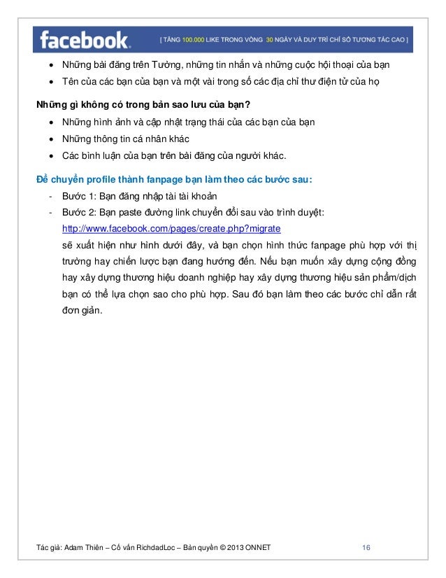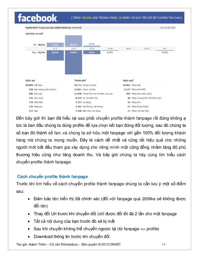 - 13. Tác giả: Adam Thiên – Cố vấn RichdadLoc – Bản quyền © 2013 ONNET 14 Đến bây giờ thì bạn đã hiểu tại sao phải chuyển profile thành fanpage rồi đúng không ạ tức là ban đầu chúng ta dùng profile để lựa chọn kết bạn đúng đối tượng, sau đó chúng ta số bạn đó thành số fan, và chúng ta sở hữu một fanpage với gần 100% đối tượng khách hàng mà chúng ta mong muốn. Đây là cách dễ nhất và cũng rất hiệu quả cho những người mới bắt đầu tham gia xây dựng cho riêng mình một cộng đồng nhằm tăng độ phủ thương hiệu cũng như tăng doanh thu. Và bây giờ chúng ta hãy cùng tìm hiểu cách chuyển profile thành fanpage. Cách chuyển profile thành fanpage Trước khi tìm hiểu về cách chuyển profile thành fanpage chúng ta cần lưu ý một số điểm sau: Đảm bảo tên hiển thị đã chính xác (đối với fanpage quá 200like sẽ không được đổi tên) Thay đổi Url trươc khi chuyển đổi (chỉ được đổi tối đa 2 lần cho một fanpage Tất cả nội dung của bạn trước đó sẽ bị mất Sau khi chuyển không thể chuyển ngược lại (từ fanpage => profile) Download thông tin trước khi chuyển đổi