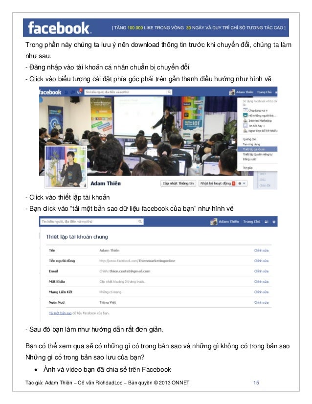 - 14. Tác giả: Adam Thiên – Cố vấn RichdadLoc – Bản quyền © 2013 ONNET 15 Trong phần này chúng ta lưu ý nên download thông tin trước khi chuyển đổi, chúng ta làm như sau. - Đăng nhập vào tài khoản cá nhân chuẩn bị chuyển đổi - Click vào biểu tượng cài đặt phía góc phải trên gần thanh điều hướng như hình vẽ - Click vào thiết lập tài khoản - Bạn click vào “tải một bản sao dữ liệu facebook của bạn” như hình vẽ - Sau đó bạn làm như hướng dẫn rất đơn giản. Bạn có thể xem qua sẽ có những gì có trong bản sao và những gì không có trong bản sao Những gì có trong bản sao lưu của bạn? Ảnh và video bạn đã chia sẻ trên Facebook