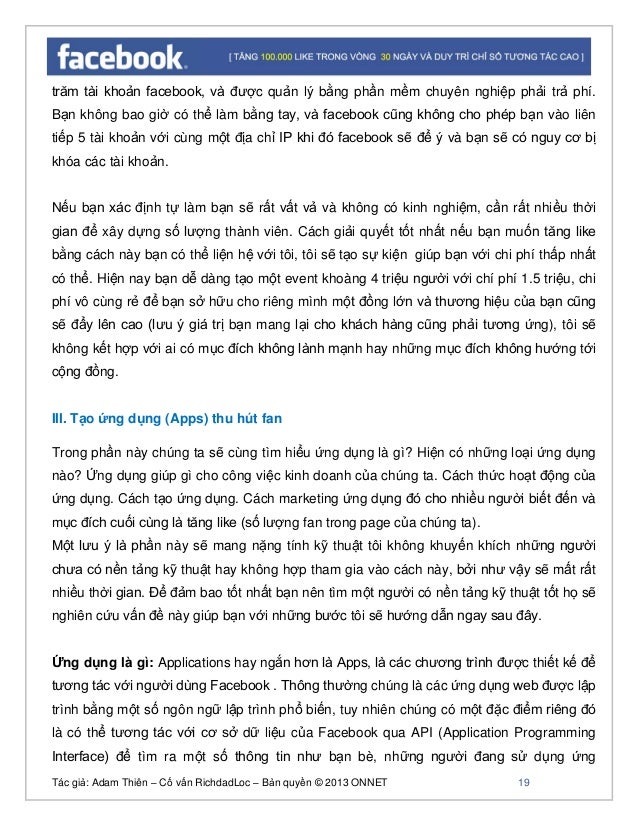 - 18. Tác giả: Adam Thiên – Cố vấn RichdadLoc – Bản quyền © 2013 ONNET 19 trăm tài khoản facebook, và được quản lý bằng phần mềm chuyên nghiệp phải trả phí. Bạn không bao giờ có thể làm bằng tay, và facebook cũng không cho phép bạn vào liên tiếp 5 tài khoản với cùng một địa chỉ IP khi đó facebook sẽ để ý và bạn sẽ có nguy cơ bị khóa các tài khoản. Nếu bạn xác định tự làm bạn sẽ rất vất vả và không có kinh nghiệm, cần rất nhiều thời gian để xây dựng số lượng thành viên. Cách giải quyết tốt nhất nếu bạn muốn tăng like bằng cách này bạn có thể liện hệ với tôi, tôi sẽ tạo sự kiện giúp bạn với chi phí thấp nhất có thể. Hiện nay bạn dễ dàng tạo một event khoàng 4 triệu người với chí phí 1.5 triệu, chi phí vô cùng rẻ để bạn sở hữu cho riêng mình một đồng lớn và thương hiệu của bạn cũng sẽ đẩy lên cao (lưu ý giá trị bạn mang lại cho khách hàng cũng phải tương ứng), tôi sẽ không kết hợp với ai có mục đích không lành mạnh hay những mục đích không hướng tới cộng đồng. III. Tạo ứng dụng (Apps) thu hút fan Trong phần này chúng ta sẽ cùng tìm hiểu ứng dụng là gì? Hiện có những loại ứng dụng nào? Ứng dụng giúp gì cho công việc kinh doanh của chúng ta. Cách thức hoạt động của ứng dụng. Cách tạo ứng dụng. Cách marketing ứng dụng đó cho nhiều người biết đến và mục đích cuối cùng là tăng like (số lượng fan trong page của chúng ta). Một lưu ý là phần này sẽ mang nặng tính kỹ thuật tôi không khuyến khích những người chưa có nền tảng kỹ thuật hay không hợp tham gia vào cách này, bởi như vậy sẽ mất rất nhiều thời gian. Để đảm bao tốt nhất bạn nên tìm một người có nền tảng kỹ thuật tốt họ sẽ nghiên cứu vấn đề này giúp bạn với những bước tôi sẽ hướng dẫn ngay sau đây. Ứng dụng là gì: Applications hay ngắn hơn là Apps, là các chương trình được thiết kế để tương tác với người dùng Facebook . Thông thường chúng là các ứng dụng web được lập trình bằng một số ngôn ngữ lập trình phổ biến, tuy nhiên chúng có một đặc điểm riêng đó là có thể tương tác với cơ sở dữ liệu của Facebook qua API (Application Programming Interface) để tìm ra một số thông tin như bạn bè, những người đang sử dụng ứng