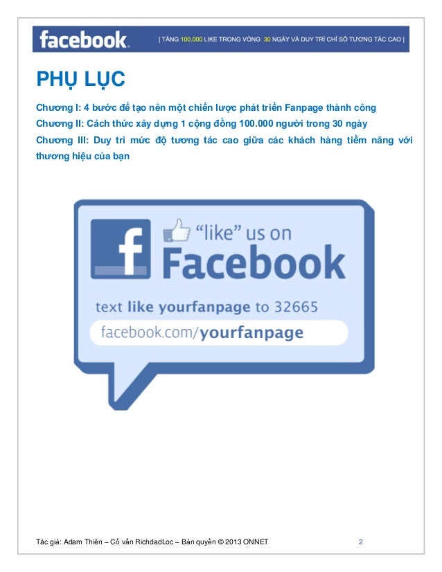- 1. Tác giả: Adam Thiên – Cố vấn RichdadLoc – Bản quyền © 2013 ONNET 2 PHỤ LỤC Chương I: 4 bước để tạo nên một chiến lược phát triển Fanpage thành công Chương II: Cách thức xây dựng 1 cộng đồng 100.000 người trong 30 ngày Chương III: Duy trì mức độ tương tác cao giữa các khách hàng tiềm năng với thương hiệu của bạn