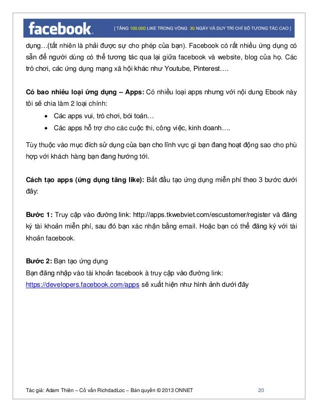 - 19. Tác giả: Adam Thiên – Cố vấn RichdadLoc – Bản quyền © 2013 ONNET 20 dụng…(tất nhiên là phải được sự cho phép của bạn). Facebook có rất nhiều ứng dụng có sẵn để người dùng có thể tương tác qua lại giữa facebook và website, blog của họ. Các trò chơi, các ứng dụng mạng xã hội khác như Youtube, Pinterest…. Có bao nhiêu loại ứng dụng – Apps: Có nhiều loại apps nhưng với nội dung Ebook này tôi sẽ chia làm 2 loại chính: Các apps vui, trò chơi, bói toán… Các apps hỗ trợ cho các cuộc thi, công việc, kinh doanh…. Tùy thuộc vào mục đích sử dụng của bạn cho lĩnh vực gì bạn đang hoạt động sao cho phù hợp với khách hàng bạn đang hướng tới. Cách tạo apps (ứng dụng tăng like): Bắt đầu tạo ứng dụng miễn phí theo 3 bước dưới đây: Bước 1: Truy cập vào đường link: http://apps.tkwebviet.com/escustomer/register và đăng ký tài khoản miễn phí, sau đó bạn xác nhận bằng email. Hoặc bạn có thể đăng ký với tài khoản facebook. Bước 2: Bạn tạo ứng dụng Bạn đăng nhập vào tài khoản facebook à truy cập vào đường link: https://developers.facebook.com/apps sẽ xuất hiện như hình ảnh dưới đây