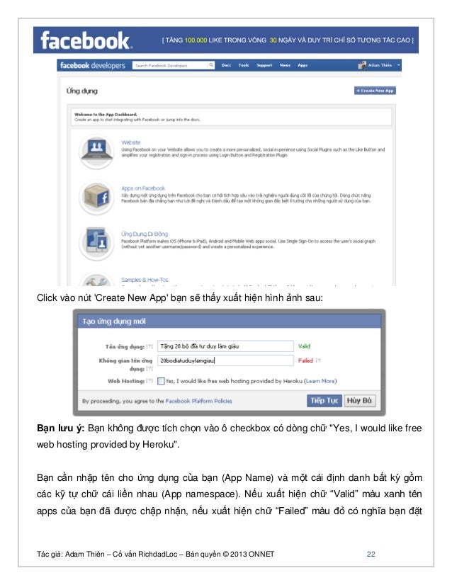 - 21. Tác giả: Adam Thiên – Cố vấn RichdadLoc – Bản quyền © 2013 ONNET 22 Click vào nút 'Create New App' bạn sẽ thấy xuất hiện hình ảnh sau: Bạn lưu ý: Bạn không được tích chọn vào ô checkbox có dòng chữ "Yes, I would like free web hosting provided by Heroku". Bạn cần nhập tên cho ứng dụng của bạn (App Name) và một cái định danh bất kỳ gồm các kỹ tự chữ cái liền nhau (App namespace). Nếu xuất hiện chữ “Valid” màu xanh tên apps của bạn đã được chập nhận, nếu xuất hiện chữ “Failed” màu đỏ có nghĩa bạn đặt