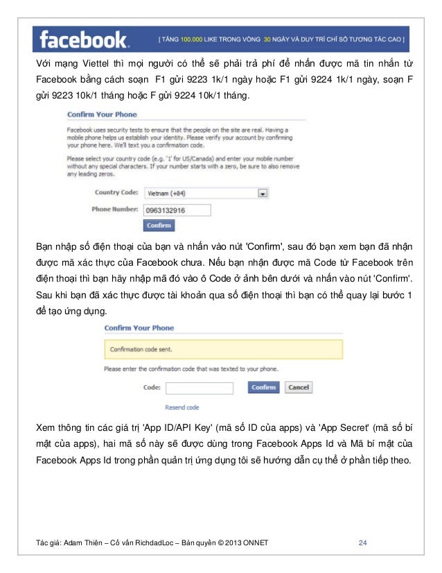 - 23. Tác giả: Adam Thiên – Cố vấn RichdadLoc – Bản quyền © 2013 ONNET 24 Với mạng Viettel thì mọi người có thể sẽ phải trả phí để nhấn được mã tin nhắn từ Facebook bằng cách soạn F1 gửi 9223 1k/1 ngày hoặc F1 gửi 9224 1k/1 ngày, soạn F gửi 9223 10k/1 tháng hoặc F gửi 9224 10k/1 tháng. Bạn nhập số điện thoại của bạn và nhấn vào nút 'Confirm', sau đó bạn xem bạn đã nhận được mã xác thực của Facebook chưa. Nếu bạn nhận được mã Code từ Facebook trên điện thoại thì bạn hãy nhập mã đó vào ô Code ở ảnh bên dưới và nhấn vào nút 'Confirm'. Sau khi bạn đã xác thực được tài khoản qua số điện thoại thì bạn có thể quay lại bước 1 để tạo ứng dụng. Xem thông tin các giá trị 'App ID/API Key' (mã số ID của apps) và 'App Secret' (mã số bí mật của apps), hai mã số này sẽ được dùng trong Facebook Apps Id và Mã bí mật của Facebook Apps Id trong phần quản trị ứng dụng tôi sẽ hướng dẫn cụ thể ở phần tiếp theo.