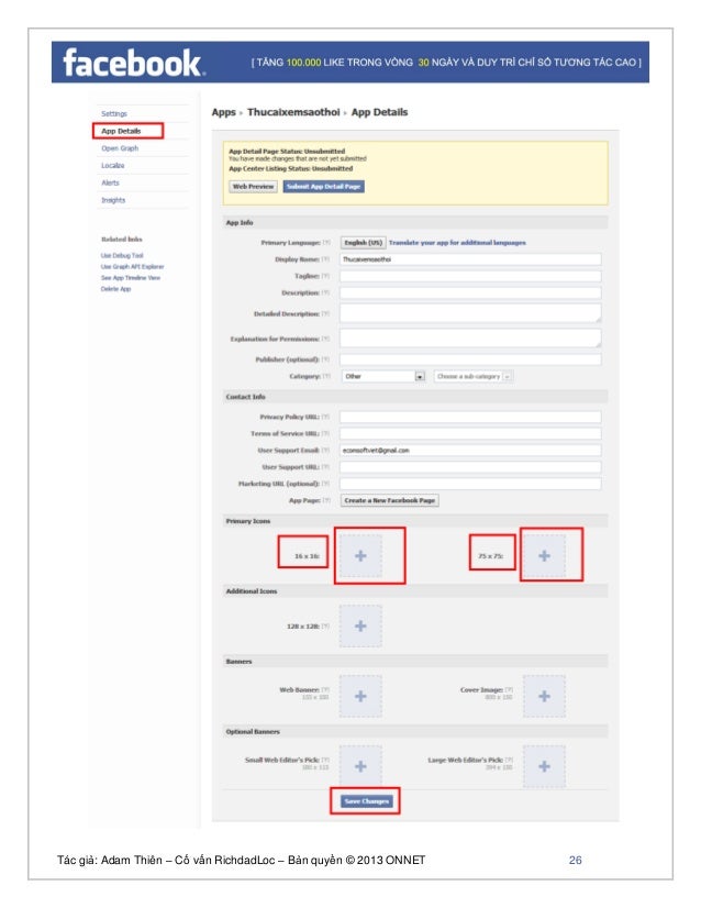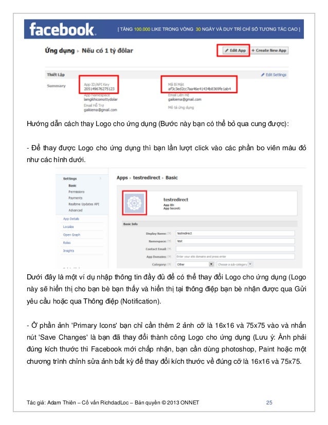 - 24. Tác giả: Adam Thiên – Cố vấn RichdadLoc – Bản quyền © 2013 ONNET 25 Hướng dẫn cách thay Logo cho ứng dụng (Bước này bạn có thể bỏ qua cung được): - Để thay được Logo cho ứng dụng thì bạn lần lượt click vào các phần bo viên màu đỏ như các hình dưới. Dưới đây là một ví dụ nhập thông tin đầy đủ để có thể thay đổi Logo cho ứng dụng (Logo này sẽ hiển thị cho bạn bè bạn thấy và hiển thị tại thông điệp bạn bè nhận được qua Gửi yêu cầu hoặc qua Thông điệp (Notification). - Ở phần ảnh 'Primary Icons' bạn chỉ cần thêm 2 ảnh cỡ là 16x16 và 75x75 vào và nhấn nút 'Save Changes' là bạn đã thay đổi thành công Logo cho ứng dụng (Lưu ý: Ảnh phải đúng kích thước thì Facebook mới chấp nhận, bạn cần dùng photoshop, Paint hoặc một chương trình chỉnh sửa ảnh bất kỳ để thay đổi kích thước về đúng cỡ là 16x16 và 75x75.