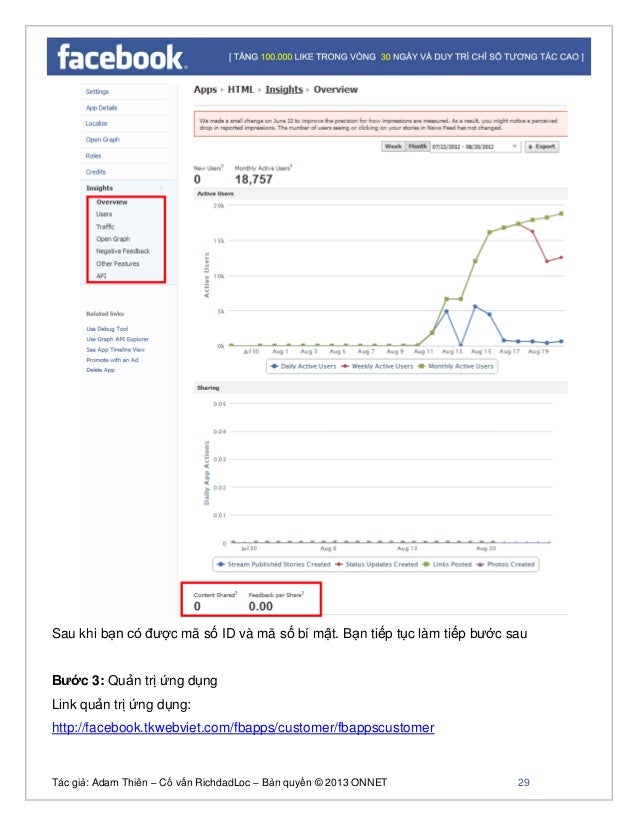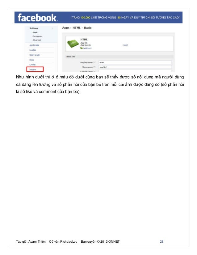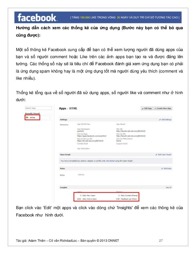 - 26. Tác giả: Adam Thiên – Cố vấn RichdadLoc – Bản quyền © 2013 ONNET 27 Hướng dẫn cách xem các thống kê của ứng dụng (Bước này bạn có thể bỏ qua cũng được): Một số thông kê Facebook cung cấp để bạn có thể xem lượng người đã dùng apps của bạn và số người comment hoặc Like trên các ảnh apps bạn tạo ra và được đăng lên tường. Các thống số này sẽ là tiêu chí để Facebook đánh giá xem ứng dụng bạn có phải là ứng dụng spam không hay là một ứng dụng tốt mà người dùng yêu thích (comment và like nhiều). Thống kê tổng qua về số người đã sử dụng apps, số người like và comment như ở hình dưới: Bạn click vào 'Edit' một apps và click vào dòng chứ 'Insights' để xem các thông kê của Facebook như hình dưới.
