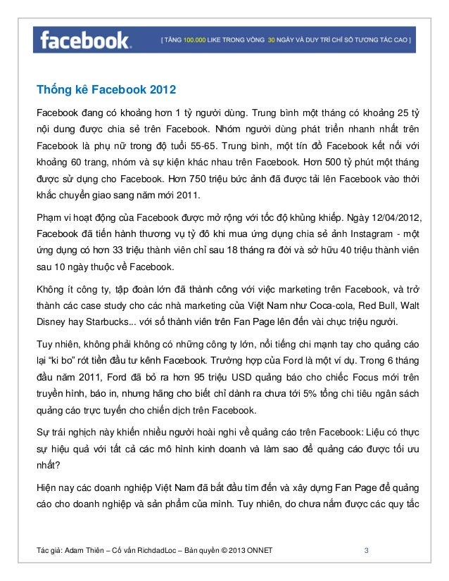 - 2. Tác giả: Adam Thiên – Cố vấn RichdadLoc – Bản quyền © 2013 ONNET 3 Thống kê Facebook 2012 Facebook đang có khoảng hơn 1 tỷ người dùng. Trung bình một tháng có khoảng 25 tỷ nội dung được chia sẻ trên Facebook. Nhóm người dùng phát triển nhanh nhất trên Facebook là phụ nữ trong độ tuổi 55-65. Trung bình, một tín đồ Facebook kết nối với khoảng 60 trang, nhóm và sự kiện khác nhau trên Facebook. Hơn 500 tỷ phút một tháng được sử dụng cho Facebook. Hơn 750 triệu bức ảnh đã được tải lên Facebook vào thời khắc chuyển giao sang năm mới 2011. Phạm vi hoạt động của Facebook được mở rộng với tốc độ khủng khiếp. Ngày 12/04/2012, Facebook đã tiến hành thương vụ tỷ đô khi mua ứng dụng chia sẻ ảnh Instagram - một ứng dụng có hơn 33 triệu thành viên chỉ sau 18 tháng ra đời và sở hữu 40 triệu thành viên sau 10 ngày thuộc về Facebook. Không ít công ty, tập đoàn lớn đã thành công với việc marketing trên Facebook, và trở thành các case study cho các nhà marketing của Việt Nam như Coca-cola, Red Bull, Walt Disney hay Starbucks... với số thành viên trên Fan Page lên đến vài chục triệu người. Tuy nhiên, không phải không có những công ty lớn, nổi tiếng chi mạnh tay cho quảng cáo lại “ki bo” rót tiền đầu tư kênh Facebook. Trường hợp của Ford là một ví dụ. Trong 6 tháng đầu năm 2011, Ford đã bỏ ra hơn 95 triệu USD quảng báo cho chiếc Focus mới trên truyền hình, báo in, nhưng hãng cho biết chỉ dành ra chưa tới 5% tổng chi tiêu ngân sách quảng cáo trực tuyến cho chiến dịch trên Facebook. Sự trái nghịch này khiến nhiều người hoài nghi về quảng cáo trên Facebook: Liệu có thực sự hiệu quả với tất cả các mô hình kinh doanh và làm sao để quảng cáo được tối ưu nhất? Hiện nay các doanh nghiệp Việt Nam đã bắt đầu tìm đến và xây dựng Fan Page để quảng cáo cho doanh nghiệp và sản phẩm của mình. Tuy nhiên, do chưa nắm được các quy tắc