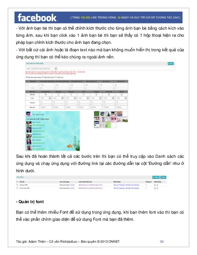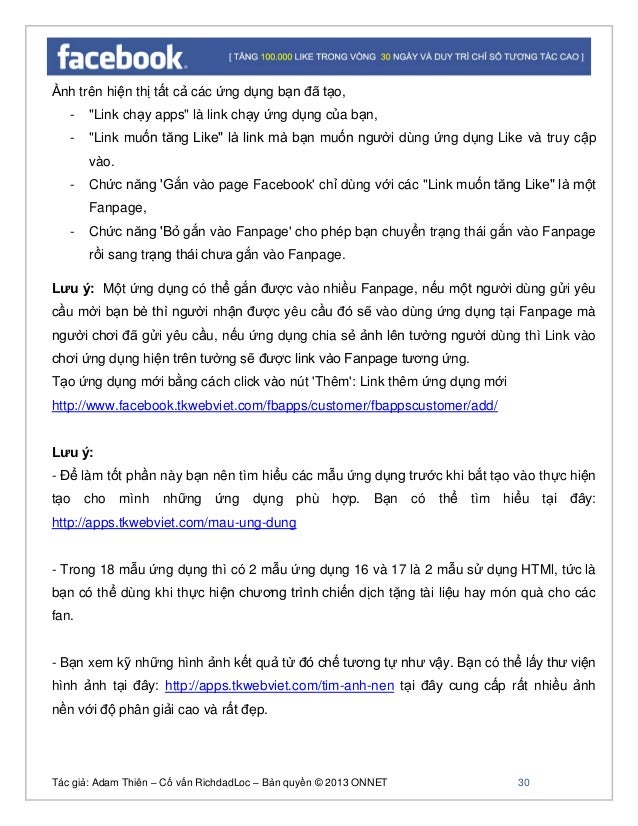 - 29. Tác giả: Adam Thiên – Cố vấn RichdadLoc – Bản quyền © 2013 ONNET 30 Ảnh trên hiện thị tất cả các ứng dụng bạn đã tạo, - "Link chạy apps" là link chạy ứng dụng của bạn, - "Link muốn tăng Like" là link mà bạn muốn người dùng ứng dụng Like và truy cập vào. - Chức năng 'Gắn vào page Facebook' chỉ dùng với các "Link muốn tăng Like" là một Fanpage, - Chức năng 'Bỏ gắn vào Fanpage' cho phép bạn chuyển trạng thái gắn vào Fanpage rồi sang trạng thái chưa gắn vào Fanpage. Lưu ý: Một ứng dụng có thể gắn được vào nhiều Fanpage, nếu một người dùng gửi yêu cầu mời bạn bè thì người nhận được yêu cầu đó sẽ vào dùng ứng dụng tại Fanpage mà người chơi đã gửi yêu cầu, nếu ứng dụng chia sẻ ảnh lên tường người dùng thì Link vào chơi ứng dụng hiện trên tường sẽ được link vào Fanpage tương ứng. Tạo ứng dụng mới bằng cách click vào nút 'Thêm': Link thêm ứng dụng mới http://www.facebook.tkwebviet.com/fbapps/customer/fbappscustomer/add/ Lưu ý: - Để làm tốt phần này bạn nên tìm hiểu các mẫu ứng dụng trước khi bắt tạo vào thực hiện tạo cho mình những ứng dụng phù hợp. Bạn có thể tìm hiểu tại đây: http://apps.tkwebviet.com/mau-ung-dung - Trong 18 mẫu ứng dụng thì có 2 mẫu ứng dụng 16 và 17 là 2 mẫu sử dụng HTMl, tức là bạn có thể dùng khi thực hiện chương trình chiến dịch tặng tài liệu hay món quà cho các fan. - Bạn xem kỹ những hình ảnh kết quả từ đó chế tương tự như vậy. Bạn có thể lấy thư viện hình ảnh tại đây: http://apps.tkwebviet.com/tim-anh-nen tại đây cung cấp rất nhiều ảnh nền với độ phân giải cao và rất đẹp.