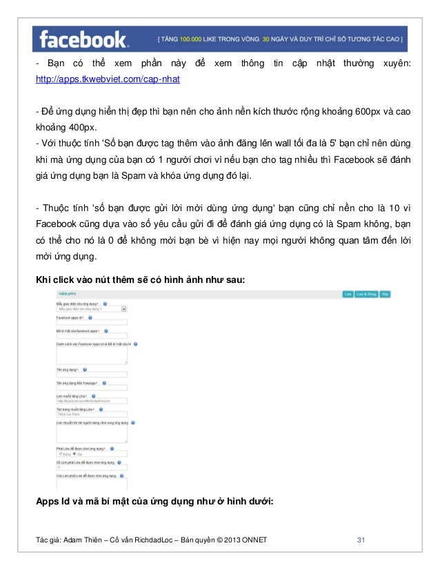 - 30. Tác giả: Adam Thiên – Cố vấn RichdadLoc – Bản quyền © 2013 ONNET 31 - Bạn có thể xem phần này để xem thông tin cập nhật thường xuyên: http://apps.tkwebviet.com/cap-nhat - Để ứng dụng hiển thị đẹp thì bạn nên cho ảnh nền kích thước rộng khoảng 600px và cao khoảng 400px. - Với thuộc tính 'Số bạn được tag thêm vào ảnh đăng lên wall tối đa là 5' bạn chỉ nên dùng khi mà ứng dụng của bạn có 1 người chơi vì nếu bạn cho tag nhiều thì Facebook sẽ đánh giá ứng dụng bạn là Spam và khóa ứng dụng đó lại. - Thuộc tính 'số bạn được gửi lời mời dùng ứng dụng' bạn cũng chỉ nền cho là 10 vì Facebook cũng dựa vào số yêu cầu gửi đi để đánh giá ứng dụng có là Spam không, bạn có thể cho nó là 0 để không mời bạn bè vì hiện nay mọi người không quan tâm đến lời mời ứng dụng. Khi click vào nút thêm sẽ có hình ảnh như sau: Apps Id và mã bí mật của ứng dụng như ở hình dưới: