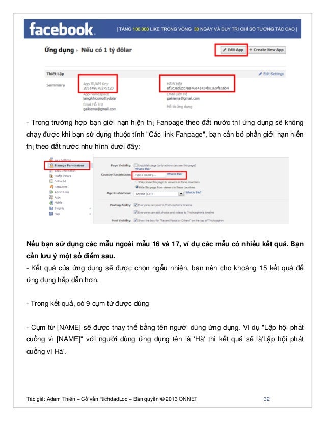 - 31. Tác giả: Adam Thiên – Cố vấn RichdadLoc – Bản quyền © 2013 ONNET 32 - Trong trường hợp bạn giới hạn hiện thị Fanpage theo đất nước thì ứng dụng sẽ không chạy được khi bạn sử dụng thuộc tính "Các link Fanpage", bạn cần bỏ phần giới hạn hiển thị theo đất nước như hình dưới đây: Nếu bạn sử dụng các mẫu ngoài mẫu 16 và 17, ví dụ các mẫu có nhiều kết quả. Bạn cần lưu ý một số điểm sau. - Kết quả của ứng dụng sẽ được chọn ngẫu nhiên, bạn nên cho khoảng 15 kết quả để ứng dụng hấp dẫn hơn. - Trong kết quả, có 9 cụm từ được dùng - Cụm từ [NAME] sẽ được thay thế bằng tên người dùng ứng dụng. Ví dụ "Lập hội phát cuồng vì [NAME]" với người dùng ứng dụng tên là 'Hà' thì kết quả sẽ là'Lập hội phát cuồng vì Hà'.
