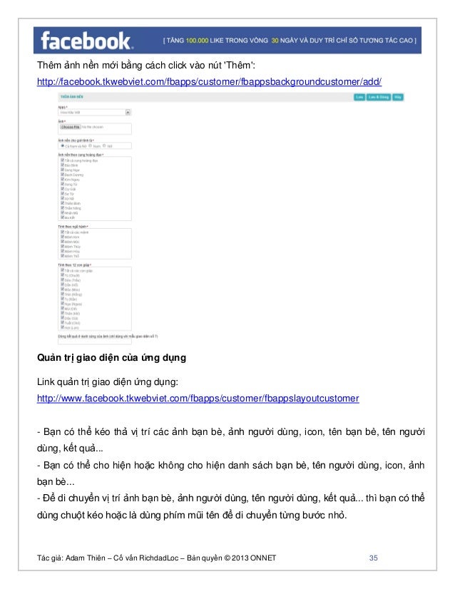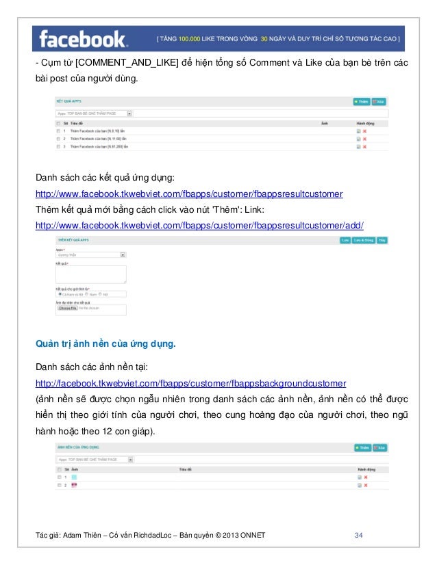 - 33. Tác giả: Adam Thiên – Cố vấn RichdadLoc – Bản quyền © 2013 ONNET 34 - Cụm từ [COMMENT_AND_LIKE] để hiện tổng số Comment và Like của bạn bè trên các bài post của người dùng. Danh sách các kết quả ứng dụng: http://www.facebook.tkwebviet.com/fbapps/customer/fbappsresultcustomer Thêm kết quả mới bằng cách click vào nút 'Thêm': Link: http://www.facebook.tkwebviet.com/fbapps/customer/fbappsresultcustomer/add/ Quản trị ảnh nền của ứng dụng. Danh sách các ảnh nền tại: http://facebook.tkwebviet.com/fbapps/customer/fbappsbackgroundcustomer (ảnh nền sẽ được chọn ngẫu nhiên trong danh sách các ảnh nền, ảnh nền có thể được hiển thị theo giới tính của người chơi, theo cung hoàng đạo của người chơi, theo ngũ hành hoặc theo 12 con giáp).
