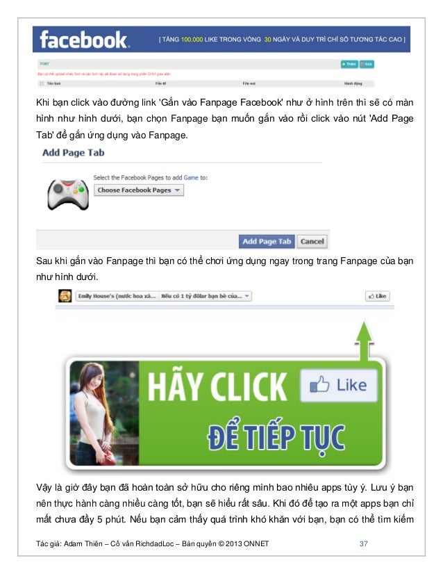 - 36. Tác giả: Adam Thiên – Cố vấn RichdadLoc – Bản quyền © 2013 ONNET 37 Khi bạn click vào đường link 'Gắn vào Fanpage Facebook' như ở hình trên thì sẽ có màn hình như hình dưới, bạn chọn Fanpage bạn muốn gắn vào rồi click vào nút 'Add Page Tab' để gắn ứng dụng vào Fanpage. Sau khi gắn vào Fanpage thì bạn có thể chơi ứng dụng ngay trong trang Fanpage của bạn như hình dưới. Vậy là giờ đây bạn đã hoàn toàn sở hữu cho riêng mình bao nhiêu apps tùy ý. Lưu ý bạn nên thực hành càng nhiều càng tốt, bạn sẽ hiểu rất sâu. Khi đó để tạo ra một apps bạn chỉ mất chưa đầy 5 phút. Nếu bạn cảm thấy quá trình khó khăn với bạn, bạn có thể tìm kiếm