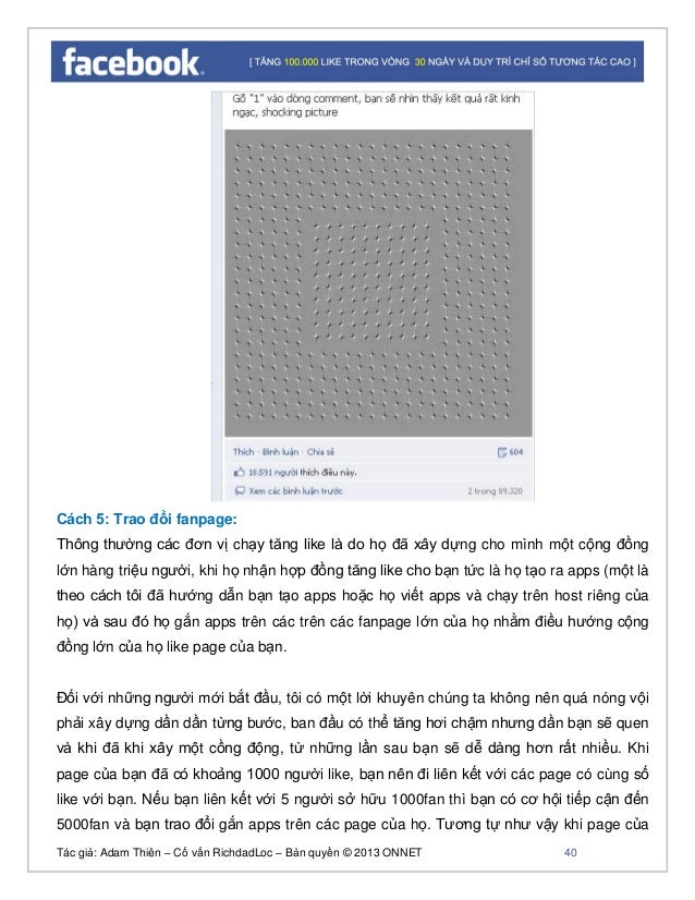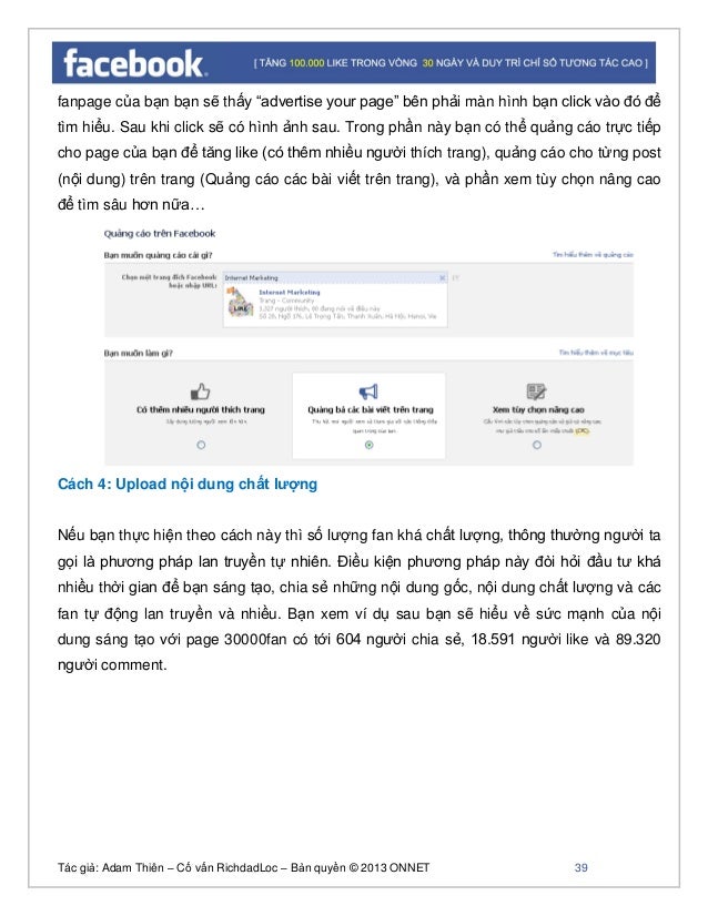 - 38. Tác giả: Adam Thiên – Cố vấn RichdadLoc – Bản quyền © 2013 ONNET 39 fanpage của bạn bạn sẽ thấy “advertise your page” bên phải màn hình bạn click vào đó để tìm hiểu. Sau khi click sẽ có hình ảnh sau. Trong phần này bạn có thể quảng cáo trực tiếp cho page của bạn để tăng like (có thêm nhiều người thích trang), quảng cáo cho từng post (nội dung) trên trang (Quảng cáo các bài viết trên trang), và phần xem tùy chọn nâng cao để tìm sâu hơn nữa… Cách 4: Upload nội dung chất lượng Nếu bạn thực hiện theo cách này thì số lượng fan khá chất lượng, thông thường người ta gọi là phương pháp lan truyền tự nhiên. Điều kiện phương pháp này đòi hỏi đầu tư khá nhiều thời gian để bạn sáng tạo, chia sẻ những nội dung gốc, nội dung chất lượng và các fan tự động lan truyền và nhiều. Bạn xem ví dụ sau bạn sẽ hiểu về sức mạnh của nội dung sáng tạo với page 30000fan có tới 604 người chia sẻ, 18.591 người like và 89.320 người comment.
