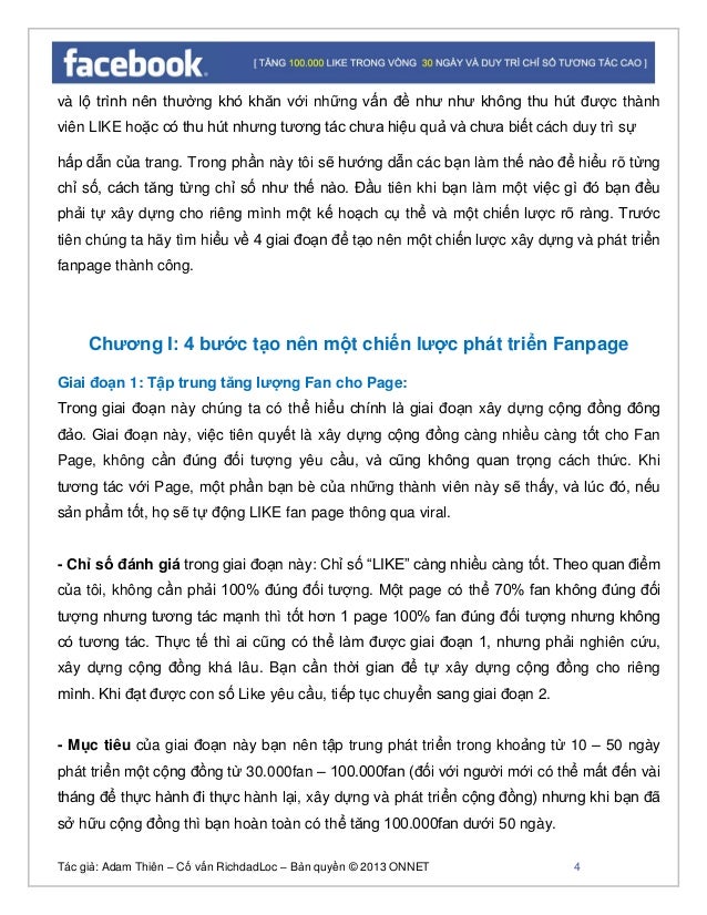 - 3. Tác giả: Adam Thiên – Cố vấn RichdadLoc – Bản quyền © 2013 ONNET 4 và lộ trình nên thường khó khăn với những vấn đề như như không thu hút được thành viên LIKE hoặc có thu hút nhưng tương tác chưa hiệu quả và chưa biết cách duy trì sự hấp dẫn của trang. Trong phần này tôi sẽ hướng dẫn các bạn làm thế nào để hiểu rõ từng chỉ số, cách tăng từng chỉ số như thế nào. Đầu tiên khi bạn làm một việc gì đó bạn đều phải tự xây dựng cho riêng mình một kế hoạch cụ thể và một chiến lược rõ ràng. Trước tiên chúng ta hãy tìm hiểu về 4 giai đoạn để tạo nên một chiến lược xây dựng và phát triển fanpage thành công. Chương I: 4 bước tạo nên một chiến lược phát triển Fanpage Giai đoạn 1: Tập trung tăng lượng Fan cho Page: Trong giai đoạn này chúng ta có thể hiểu chính là giai đoạn xây dựng cộng đồng đông đảo. Giai đoạn này, việc tiên quyết là xây dựng cộng đồng càng nhiều càng tốt cho Fan Page, không cần đúng đối tượng yêu cầu, và cũng không quan trọng cách thức. Khi tương tác với Page, một phần bạn bè của những thành viên này sẽ thấy, và lúc đó, nếu sản phẩm tốt, họ sẽ tự động LIKE fan page thông qua viral. - Chỉ số đánh giá trong giai đoạn này: Chỉ số “LIKE” càng nhiều càng tốt. Theo quan điểm của tôi, không cần phải 100% đúng đối tượng. Một page có thể 70% fan không đúng đối tượng nhưng tương tác mạnh thì tốt hơn 1 page 100% fan đúng đối tượng nhưng không có tương tác. Thực tế thì ai cũng có thể làm được giai đoạn 1, nhưng phải nghiên cứu, xây dựng cộng đồng khá lâu. Bạn cần thời gian để tự xây dựng cộng đồng cho riêng mình. Khi đạt được con số Like yêu cầu, tiếp tục chuyển sang giai đoạn 2. - Mục tiêu của giai đoạn này bạn nên tập trung phát triển trong khoảng từ 10 – 50 ngày phát triển một cộng đồng từ 30.000fan – 100.000fan (đối với người mới có thể mất đến vài tháng để thực hành đi thực hành lại, xây dựng và phát triển cộng đồng) nhưng khi bạn đã sở hữu cộng đồng thì bạn hoàn toàn có thể tăng 100.000fan dưới 50 ngày.