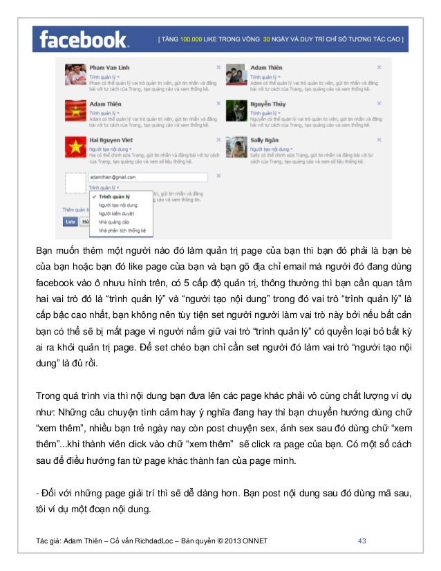 - 42. Tác giả: Adam Thiên – Cố vấn RichdadLoc – Bản quyền © 2013 ONNET 43 Bạn muốn thêm một người nào đó làm quản trị page của bạn thì bạn đó phải là bạn bè của bạn hoặc bạn đó like page của bạn và bạn gõ địa chỉ email mà người đó đang dùng facebook vào ô nhưu hình trên, có 5 cấp độ quản trị, thông thường thì bạn cần quan tâm hai vai trò đó là “trình quản lý” và “người tạo nội dung” trong đó vai trò “trình quản lý” là cấp bậc cao nhất, bạn không nên tùy tiện set người người làm vai trò này bởi nếu bất cản bạn có thể sẽ bị mất page vì người nắm giữ vai trò “trình quản lý” có quyền loại bỏ bất kỳ ai ra khỏi quản trị page. Để set chéo bạn chỉ cần set người đó làm vai trò “người tạo nội dung” là đủ rồi. Trong quá trình via thì nội dung bạn đưa lên các page khác phải vô cùng chất lượng ví dụ như: Những câu chuyện tình cảm hay ý nghĩa đang hay thì bạn chuyển hướng dùng chữ “xem thêm”, nhiều bạn trẻ ngày nay còn post chuyện sex, ảnh sex sau đó dùng chữ “xem thêm”...khi thành viên click vào chữ “xem thêm” sẽ click ra page của bạn. Có một số cách sau để điều hướng fan từ page khác thành fan của page mình. - Đối với những page giải trí thì sẽ dễ dàng hơn. Bạn post nội dung sau đó dùng mã sau, tôi ví dụ một đoạn nội dung.