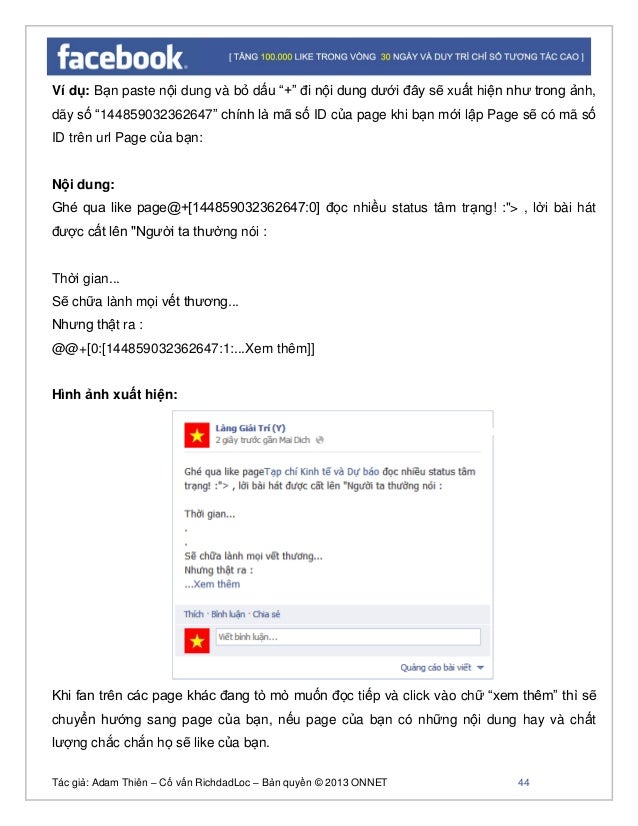 - 43. Tác giả: Adam Thiên – Cố vấn RichdadLoc – Bản quyền © 2013 ONNET 44 Ví dụ: Bạn paste nội dung và bỏ dấu “+” đi nội dung dưới đây sẽ xuất hiện như trong ảnh, dãy số “144859032362647” chính là mã số ID của page khi bạn mới lập Page sẽ có mã số ID trên url Page của bạn: Nội dung: Ghé qua like page@+[144859032362647:0] đọc nhiều status tâm trạng! :"> , lời bài hát được cất lên "Người ta thường nói : Thời gian... Sẽ chữa lành mọi vết thương... Nhưng thật ra : @@+[0:[144859032362647:1:...Xem thêm]] Hình ảnh xuất hiện: Khi fan trên các page khác đang tò mò muốn đọc tiếp và click vào chữ “xem thêm” thì sẽ chuyển hướng sang page của bạn, nếu page của bạn có những nội dung hay và chất lượng chắc chắn họ sẽ like của bạn.