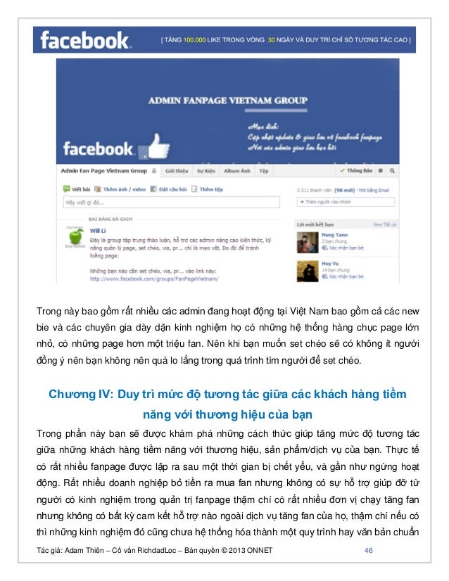 - 45. Tác giả: Adam Thiên – Cố vấn RichdadLoc – Bản quyền © 2013 ONNET 46 Trong này bao gồm rất nhiều các admin đang hoạt động tại Việt Nam bao gồm cả các new bie và các chuyên gia dày dặn kinh nghiệm họ có những hệ thống hàng chục page lớn nhỏ, có những page hơn một triệu fan. Nên khi bạn muốn set chéo sẽ có không ít người đồng ý nên bạn không nên quá lo lắng trong quá trình tìm người để set chéo. Chương IV: Duy trì mức độ tương tác giữa các khách hàng tiềm năng với thương hiệu của bạn Trong phần này bạn sẽ được khám phá những cách thức giúp tăng mức độ tương tác giữa những khách hàng tiềm năng với thương hiệu, sản phẩm/dịch vụ của bạn. Thực tế có rất nhiều fanpage được lập ra sau một thời gian bị chết yểu, và gần như ngừng hoạt động. Rất nhiều doanh nghiệp bỏ tiền ra mua fan nhưng không có sự hỗ trợ giúp đỡ từ người có kinh nghiệm trong quản trị fanpage thậm chí có rất nhiều đơn vị chạy tăng fan nhưng không có bất kỳ cam kết hỗ trợ nào ngoài dịch vụ tăng fan của họ, thậm chí nếu có thì những kinh nghiệm đó cũng chưa hệ thống hóa thành một quy trình hay văn bản chuẩn