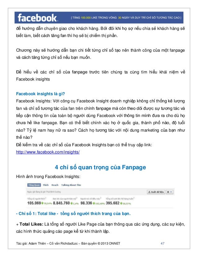 - 46. Tác giả: Adam Thiên – Cố vấn RichdadLoc – Bản quyền © 2013 ONNET 47 để hướng dẫn chuyên giao cho khách hàng. Bởi đôi khi họ sợ nếu chia sẻ khách hàng sẽ biết làm, biết cách tăng fan thì họ sẽ bị chiếm thị phần. Chương này sẽ hướng dẫn bạn chi tiết từng chỉ số tạo nên thành công của một fanpage và cách tăng từng chỉ số nếu bạn muốn. Để hiểu về các chỉ số của fanpage trước tiên chúng ta cùng tìm hiểu khái niệm về Facebook insights Facebook insights là gì? Facebook Insights: Với công cụ Facebook Insight doanh nghiệp không chỉ thống kê lượng fan và chỉ số tương tác của fan trên chính fanpage mà còn theo dõi được sự tương tác và tiếp cận thông tin của toàn bộ người dùng Facebook với thông tin mình đưa ra cho dù họ chưa hề like fanpage. Bạn có thể biết chính xác họ ở quốc gia, thành phố nào, độ tuổi nào? Tỷ lệ nam hay nữ ra sao? Cách họ tương tác với nội dung marketing của bạn như thế nào? Để kiểm tra về các chỉ số của Facebook Insights bạn có thể truy cập link: http://www.facebook.com/insights/ 4 chỉ số quan trọng của Fanpage Hình ảnh trong Facebook Insights: - Chỉ số 1: Total like - tổng số người thích trang của bạn. + Total Likes: Là tổng số người Like Page của bạn thông qua các ứng dụng, các sự kiện, các hình thức quảng cáo page kể từ khi thành lập.