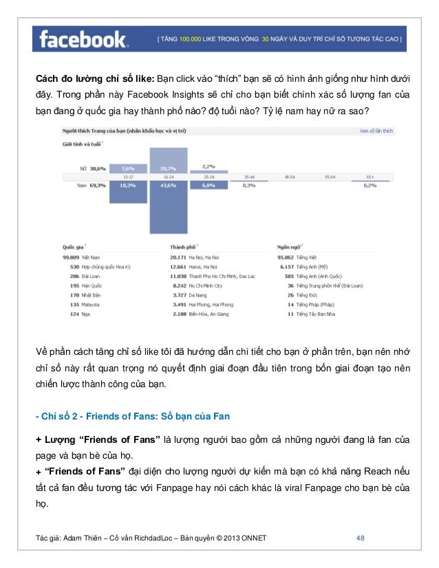 - 47. Tác giả: Adam Thiên – Cố vấn RichdadLoc – Bản quyền © 2013 ONNET 48 Cách đo lường chỉ số like: Bạn click vào “thích” bạn sẽ có hình ảnh giống như hình dưới đây. Trong phần này Facebook Insights sẽ chỉ cho bạn biết chính xác số lượng fan của bạn đang ở quốc gia hay thành phố nào? độ tuổi nào? Tỷ lệ nam hay nữ ra sao? Về phần cách tăng chỉ số like tôi đã hướng dẫn chi tiết cho bạn ở phần trên, bạn nên nhớ chỉ số này rất quan trọng nó quyết định giai đoạn đầu tiên trong bốn giai đoạn tạo nên chiến lược thành công của bạn. - Chỉ số 2 - Friends of Fans: Số bạn của Fan + Lượng “Friends of Fans” là lượng người bao gồm cả những người đang là fan của page và bạn bè của họ. + “Friends of Fans” đại diện cho lượng người dự kiến mà bạn có khả năng Reach nếu tất cả fan đều tương tác với Fanpage hay nói cách khác là viral Fanpage cho bạn bè của họ.