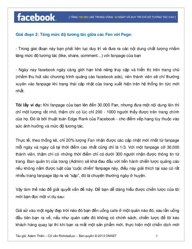 - 4. Tác giả: Adam Thiên – Cố vấn RichdadLoc – Bản quyền © 2013 ONNET 5 Giai đoạn 2: Tăng mức độ tương tác giữa các Fan với Page: - Trong giai đoạn này bạn phải liên tục duy trì và đưa ra các nội dung chất lượng nhằm tăng mức độ tương tác (like, share, comment…) với fanpage của bạn - Ngày nay facebook ngày càng giới hạn khả năng truy cập và hiển thị trên trang chủ (nhằm thu hút các chương trình quảng cáo facebook ads), nên thành viên sẽ chỉ thường xuyên vào fanpage khi trạng thái cập nhật của trang xuất hiện trên hệ thống tin tức mới nhất. Tôi lấy ví dụ: Khi fanpage của bạn lên đến 30.000 Fan, nhưng đưa một nội dung lên thì chỉ một lượng rất nhỏ, thậm chí có lúc chỉ 200 - 1000 người thấy được trên trang chính của họ. Đó là bởi thuật toán Edge Rank của Facebook - cho điểm xếp hạng tùy thuộc vào sức ảnh hưởng và mức độ tương tác. Thực tế, theo thống kê, chỉ 20% lượng Fan nhận được các cập nhật mới nhất từ fanpage mỗi ngày và ngay cả tại thời điểm cao nhất cũng chỉ là 1/3. Với một fanpage cỡ 30.000 thành viên, thậm chí có những thời điểm chỉ có dưới 300 người nhận được thông tin từ trang. Ban quản trị của trang (Admin) sẽ khá đau đầu với tiến hành chiến lược quảng cáo nếu không nắm được luật của ‘cuộc chiến’ fanpage này, điều này giải thích tại sao có rất nhiều trang fanpage lập ra và “sập”, đó là chuyện thường ngày ở huyện. Vậy làm thế nào để giải quyết vấn đề này. Để bạn dễ dàng hiểu được chiến lược của tôi mời bạn đọc một ví dụ sau: Giả sử vào một ngày đẹp trời nào đó bạn đến uống cafe ở một quán nào đó, sau lần uống đầu tiên bạn ra về, nếu như quán cafe đó không có chính sách, chiến lược để lôi kéo khách hàng quay lại thì khi bạn ra mắt một sản phẩm mới, thực hiện một chiến dịch mới