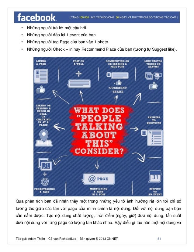 - 50. Tác giả: Adam Thiên – Cố vấn RichdadLoc – Bản quyền © 2013 ONNET 51 • Những người trả lời một câu hỏi • Những người đáp lại 1 event của bạn • Những người tag Page của bạn vào 1 photo • Những người Check – in hay Recommend Place của bạn (tương tự Suggest like). Qua phân tích bạn đã nhận thấy một trong những yếu tố ảnh hướng rất lớn tới chỉ số tương tác giữa các fan với page của mình chính là nội dung. Đối với nội dung bạn bạn cần nắm được: Tạo nội dung chất lượng, thời điểm (ngày, giờ) đưa nội dung, tần suất đưa nội dung với từng page có lượng fan khác nhau. Vậy điều gì tạo nên một nội dung và