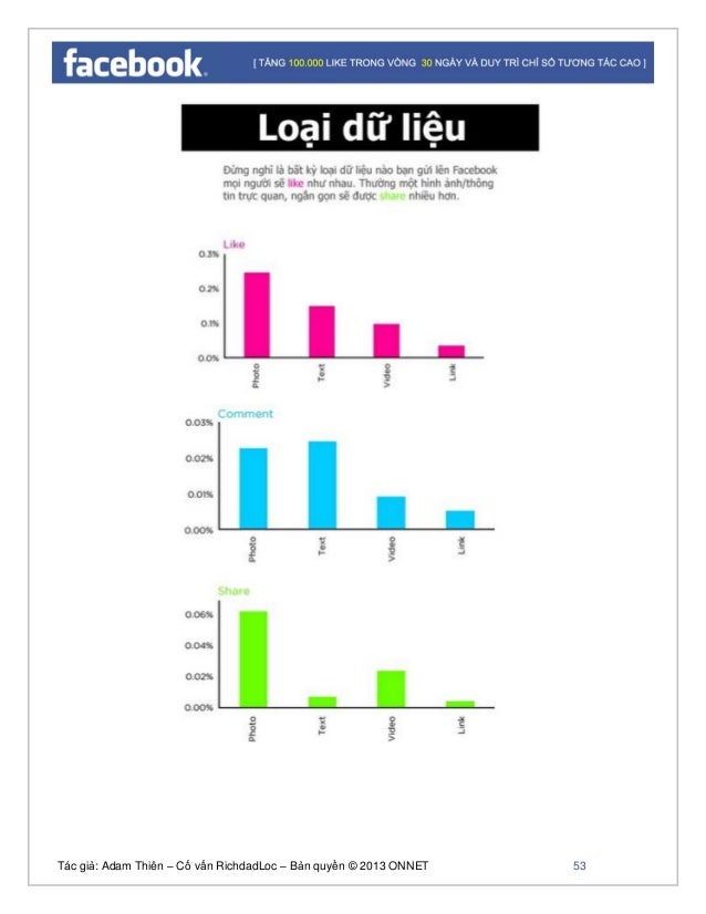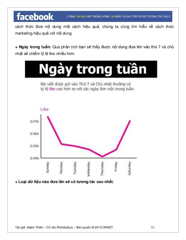 - 51. Tác giả: Adam Thiên – Cố vấn RichdadLoc – Bản quyền © 2013 ONNET 52 cách thức đưa nội dung một cách hiệu quả, chúng ta cùng tìm hiểu về cách thức marketing hiệu quả với nội dung. + Ngày trong tuần: Qua phân tích bạn sẽ thấy được nội dung đưa lên vào thứ 7 và chủ nhật sẽ chiếm tỷ lệ like nhiều hơn. + Loại dữ liệu nào đưa lên sẽ có tương tác cao nhất.