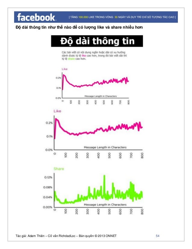 - 53. Tác giả: Adam Thiên – Cố vấn RichdadLoc – Bản quyền © 2013 ONNET 54 Độ dài thông tin như thế nào để có lượng like và share nhiều hơn