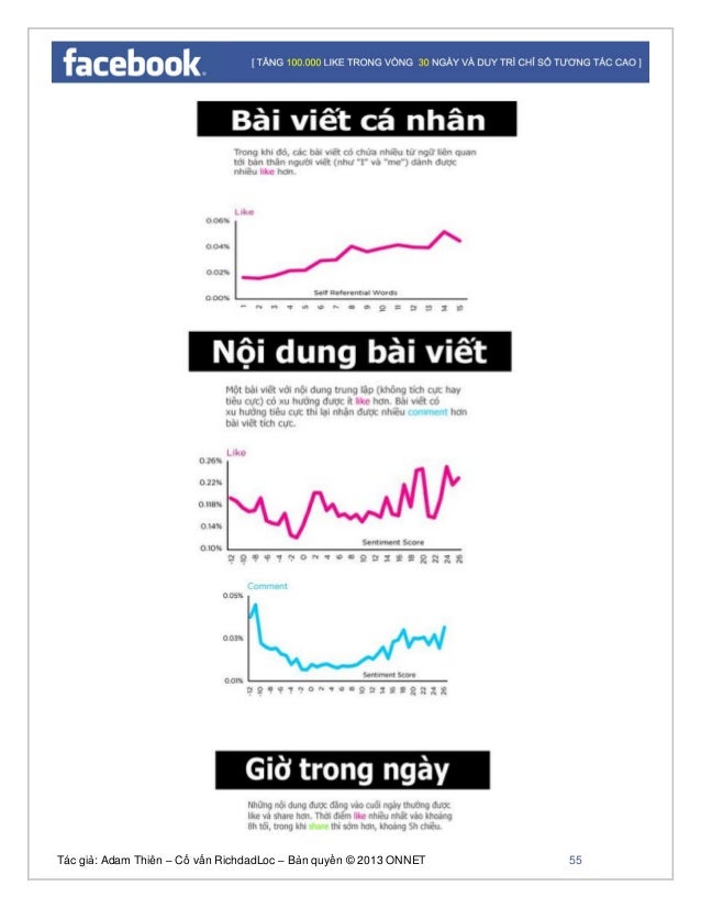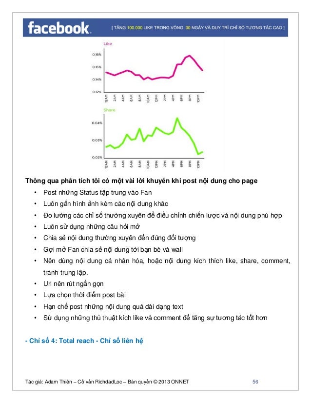 - 55. Tác giả: Adam Thiên – Cố vấn RichdadLoc – Bản quyền © 2013 ONNET 56 Thông qua phân tích tôi có một vài lời khuyên khi post nội dung cho page • Post những Status tập trung vào Fan • Luôn gắn hình ảnh kèm các nội dung khác • Đo lường các chỉ số thường xuyên để điều chỉnh chiến lược và nội dung phù hợp • Luôn sử dụng những câu hỏi mở • Chia sẻ nội dung thường xuyên đến đúng đối tượng • Gợi mở Fan chia sẻ nội dung tới bạn bè và wall • Nên dùng nội dung cá nhân hóa, hoặc nội dung kích thích like, share, comment, tránh trung lập. • Url nên rút ngắn gọn • Lựa chọn thời điểm post bài • Hạn chế post những nội dung quá dài dạng text • Sử dụng những thủ thuật kích like và comment để tăng sự tương tác tốt hơn - Chỉ số 4: Total reach - Chỉ số liên hệ