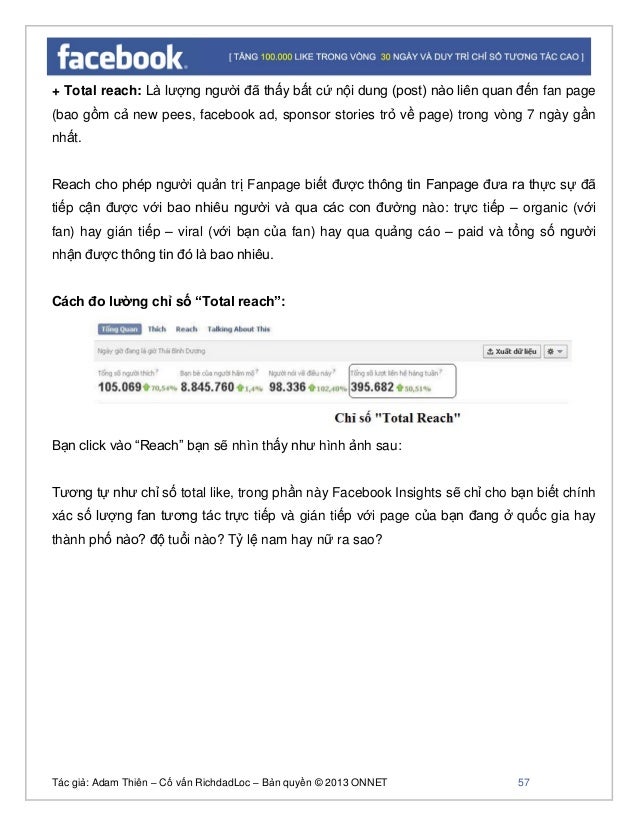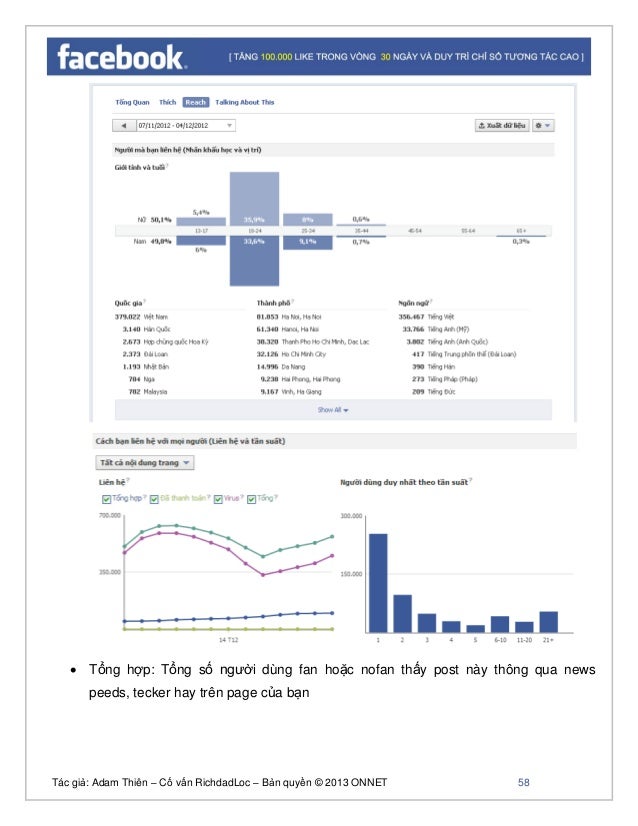 - 56. Tác giả: Adam Thiên – Cố vấn RichdadLoc – Bản quyền © 2013 ONNET 57 + Total reach: Là lượng người đã thấy bất cứ nội dung (post) nào liên quan đến fan page (bao gồm cả new pees, facebook ad, sponsor stories trỏ về page) trong vòng 7 ngày gần nhất. Reach cho phép người quản trị Fanpage biết được thông tin Fanpage đưa ra thực sự đã tiếp cận được với bao nhiêu người và qua các con đường nào: trực tiếp – organic (với fan) hay gián tiếp – viral (với bạn của fan) hay qua quảng cáo – paid và tổng số người nhận được thông tin đó là bao nhiêu. Cách đo lường chỉ số “Total reach”: Bạn click vào “Reach” bạn sẽ nhìn thấy như hình ảnh sau: Tương tự như chỉ số total like, trong phần này Facebook Insights sẽ chỉ cho bạn biết chính xác số lượng fan tương tác trực tiếp và gián tiếp với page của bạn đang ở quốc gia hay thành phố nào? độ tuổi nào? Tỷ lệ nam hay nữ ra sao?