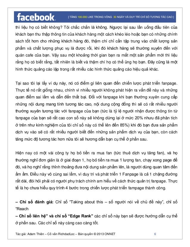 - 5. Tác giả: Adam Thiên – Cố vấn RichdadLoc – Bản quyền © 2013 ONNET 6 thì liệu họ có biết không? Tôi chắc chắn là không. Ngược lại sau lần uống đầu tiên của khách bạn thu thập thông tin của khách hàng một cách khéo léo hoặc bạn có những chính sách tốt hơn cho những khách hàng đó, thậm chí chỉ cần tập trung vào chất lượng sản phẩm và chất lượng phục vụ là được rồi, khi đó khách hàng sẽ thường xuyên đến với quán cafe của bạn. Vậy sau một khoảng thời gian bạn ra mắt một sản phẩm mới thì liệu rằng họ có biết rằng, tất nhiên là biết và thậm chí họ có thể ủng họ bạn. Đây cũng là một hình thức quảng cáo lặp trong rất nhiều các hình thức quảng cáo hiệu quả khác. Tại sao tôi lại lấy ví dụ này, nó có điểm gì liên quan đến chiến lược phát triển fanpage. Thực tế nó rất giống nhau, chính vì nhiều người không phát hiện ra vấn đề này và những quan điểm sai lầm và dẫn đến thất bại. Đối với fanpage khi bạn thường xuyên cung cấp những nội dung mang tính tương tác cao, nội dung cộng đồng thì sẽ có rất nhiều người thường xuyên tương tác với fanpage của bạn (tức là tỷ lệ người nhận được thông tin từ fanpage của bạn sẽ rất cao con số này sẽ không dừng lại ở mức 20% nhưu đã phân tích ở trên như kinh nghiệm của tôi chỉ số này có thể lên đến 85%) khi đó bạn đưa sản phẩm dịch vụ vào sẽ có rất nhiều người biết đến những sản phẩm dịch vụ của bạn, còn cách tăng mức độ tương tác hơn nữa tôi sẽ hương dẫn bạn cụ thể ở phần sau. Hiện nay có một vài công ty họ bỏ tiền ra mua fan (tức thuê dịch vụ tăng fan), và họ thường nghĩ đơn giản là ở giai đoạn 1, họ bỏ tiền ra mua 1 lượng fan, chạy xong page để đó, và họ nghĩ rằng thỉnh thoảng đưa nội dung sản phẩm lên, là người dùng quan tâm đến ầm ầm. Điều này vô cùng sai lầm, vì duy trì và phát triển 1 Fanpage là cả 1 chặng đường rất dài, đòi hỏi phải có người phụ trách chính am hiểu về cách thức quản trị fanpage. Thực tế là họ chưa hiểu quy trình 4 bước trong chiến lược phát triển fampage thành công. – Chỉ số đánh giá: Chỉ số “Taking about this – số người nói về chủ đề này”, chỉ số “Reach – Chỉ số liên hệ” và chỉ số “Edge Rank” các chỉ số này bạn sẽ được hướng dẫn cụ thể ở phần sau. Các chỉ số này càng cao càng tốt.