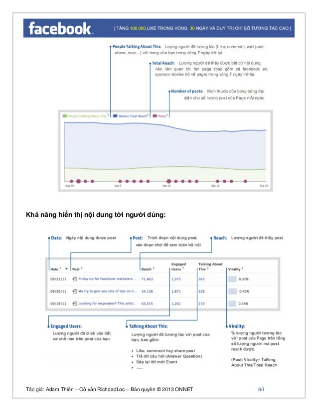- 58. Tác giả: Adam Thiên – Cố vấn RichdadLoc – Bản quyền © 2013 ONNET 59 Virus: Tổng số người thấy post của bạn thông qua hành động tương tác của bạn bè đối với post đó (được hiển thị trên new peed). Các tương tác này bao gồm: Like, comment hoặc share post, trả lời câu hỏi hay event Đã thanh toán: Tổng số người đã thấy post của bạn thông qua các loại hình quảng cáo trên Facebook như sponsor ad hay sponsor stories Chỉ số “Total reach” được tính như thế nào? Trong hình ở trên “số người đã xem bài đăng này” chính là lượng người mà Page Reach được. Total reach bằng tổng các reach của các nội dung được up trong 7 ngày gần nhất. Ảnh hưởng của nội dung đến các chỉ số