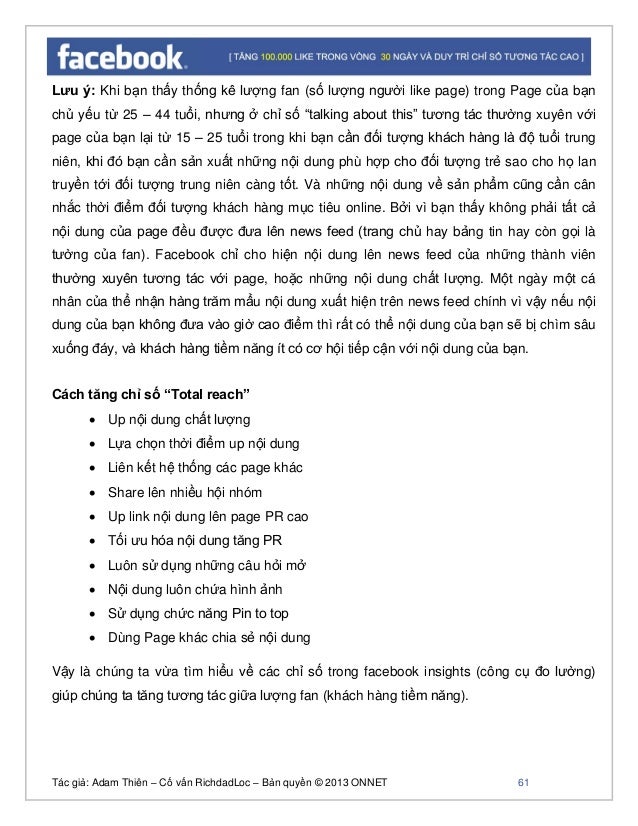 - 60. Tác giả: Adam Thiên – Cố vấn RichdadLoc – Bản quyền © 2013 ONNET 61 Lưu ý: Khi bạn thấy thống kê lượng fan (số lượng người like page) trong Page của bạn chủ yếu từ 25 – 44 tuổi, nhưng ở chỉ số “talking about this” tương tác thường xuyên với page của bạn lại từ 15 – 25 tuổi trong khi bạn cần đối tượng khách hàng là độ tuổi trung niên, khi đó bạn cần sản xuất những nội dung phù hợp cho đối tượng trẻ sao cho họ lan truyền tới đối tượng trung niên càng tốt. Và những nội dung về sản phẩm cũng cần cân nhắc thời điểm đối tượng khách hàng mục tiêu online. Bởi vì bạn thấy không phải tất cả nội dung của page đều được đưa lên news feed (trang chủ hay bảng tin hay còn gọi là tường của fan). Facebook chỉ cho hiện nội dung lên news feed của những thành viên thường xuyên tương tác với page, hoặc những nội dung chất lượng. Một ngày một cá nhân của thể nhận hàng trăm mẩu nội dung xuất hiện trên news feed chính vì vậy nếu nội dung của bạn không đưa vào giờ cao điểm thì rất có thể nội dung của bạn sẽ bị chìm sâu xuống đáy, và khách hàng tiềm năng ít có cơ hội tiếp cận với nội dung của bạn. Cách tăng chỉ số “Total reach” Up nội dung chất lượng Lựa chọn thời điểm up nội dung Liên kết hệ thống các page khác Share lên nhiều hội nhóm Up link nội dung lên page PR cao Tối ưu hóa nội dung tăng PR Luôn sử dụng những câu hỏi mở Nội dung luôn chứa hình ảnh Sử dụng chức năng Pin to top Dùng Page khác chia sẻ nội dung Vậy là chúng ta vừa tìm hiểu về các chỉ số trong facebook insights (công cụ đo lường) giúp chúng ta tăng tương tác giữa lượng fan (khách hàng tiềm năng).
