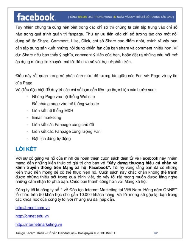 - 61. Tác giả: Adam Thiên – Cố vấn RichdadLoc – Bản quyền © 2013 ONNET 62 Tuy nhiên chúng ta cũng nên biết trong các chỉ số thì chúng ta cần tập trung vào chỉ số nào trong quá trình quản trị fanpage. Thứ tự ưu tiên các chỉ số tương tác cho một nội dung sẽ là: Share, Comment, Like, Click, chỉ số Share cao điểm nhất, chính vì vậy bạn cần tập trung sản xuất những nội dung khiến fan của bạn share và comment nhiều hơn. Ví dụ: Share nếu bạn thấy ý nghĩa, comment ý kiến của bạn, hoặc đặt ra những câu hỏi mở áp dụng những lời khuyên mà tôi đã chia sẻ với bạn ở phần trên. Điều này rất quan trọng nó phản ánh mức độ tương tác giữa các Fan với Page và uy tín của Page Và điều đặc biệt để duy trì các chỉ số bạn cần liên tục thực hiện các bước sau: - Nhúng Page vào hệ thống Website Để nhúng page vào hệ thống website - Liên kết hệ thống MXH - Email marketing - Liên kết các Fanpage cùng chủ đề - Liên kết các Fanpage cùng lượng Fan - Đặt lịch đăng tự động LỜI KẾT Với sự cố gắng và nỗ của mình để hoàn thiện cuốn sách điện tử về Facebook này nhằm mang đến những kiến thức có giá trị cho bạn về “Xây dựng thương hiệu cá nhân và kênh truyền thông trên Mạng xã hội Facebook”. Tôi hy vọng rằng bạn đã có những kiến thức nền móng để có thể thực hiện nó. Cuốn sách này chắc chắn không thể tránh được những thiếu sót trong quá trình viết, do vậy tôi rất mong muốn được lắng nghe những cảm nhận từ phía bạn. Chúc bạn thành công hơn với Mạng xã hội. Công ty tôi là công ty số 1 về Đào tạo Internet Marketing tại Việt Nam. Hàng năm ONNET tổ chức trên 50 khóa học cho gần 10.000 khách hàng. Và tôi mong sẽ gặp lại bạn trong các khóa học của công ty tôi với những ưu đãi hấp dẫn. http://onnet.com.vn http://onnet.edu.vn http://internetmarketing.vn