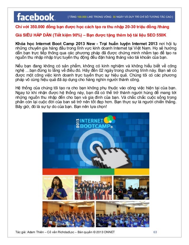 - 62. Tác giả: Adam Thiên – Cố vấn RichdadLoc – Bản quyền © 2013 ONNET 63 Chỉ với 350.000 đồng bạn được học cách tạo ra thu nhập 20-30 triệu đồng /tháng Giá SIÊU HẤP DẪN (Tiết kiệm 90%) – Bạn được tặng thêm bộ tài liệu SEO 550K Khóa học Internet Boot Camp 2013 New - Trại huấn luyện Internet 2013 nơi hội tụ những chuyên gia hàng đầu trong lĩnh vực kinh doanh Internet tại Việt Nam. Họ sẽ hướng dẫn bạn trực tiếp thông qua các phương pháp đã được chứng minh nhằm tạo để tạo ra nguồn thu nhập nhập trực tuyến thụ động đều đặn hàng tháng vào tài khoản của bạn. Nếu bạn đang không có sản phẩm, không có kinh nghiệm và không hiểu biết về công nghệ …bạn đừng lo lắng về điều đó. Hãy đến 02 ngày trong chương trình này. Bạn sẽ có được một công việc kinh doanh trực tuyến thực sự hiệu quả. Chúng tôi có các phương pháp vô cùng hiệu quả đã áp dụng cho hàng nghìn người thành công. Hệ thống của chúng tôi tạo ra cho bạn không phụ thuộc vào công việc hiện tại của bạn. Ngay từ khi nhận được hệ thống này, bạn đã có thể trở thành người hùng để mang tới những nguồn thu nhập đến cho bạn và gia đình của bạn. Và chắc chắc cuộc sống trong phần còn lại cuộc đời của ban sẽ trở nên tốt đẹp hơn. Bạn thực sự là người chiến thắng. Bây giờ, đó là sự tự do của bạn. Bạn nên lựa chọn!