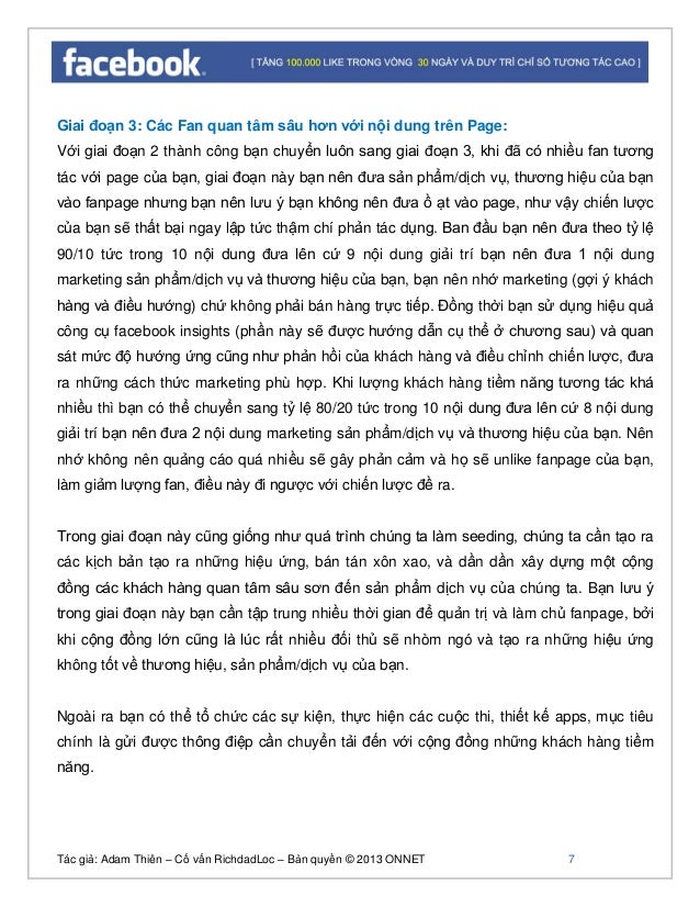 - 6. Tác giả: Adam Thiên – Cố vấn RichdadLoc – Bản quyền © 2013 ONNET 7 Giai đoạn 3: Các Fan quan tâm sâu hơn với nội dung trên Page: Với giai đoạn 2 thành công bạn chuyển luôn sang giai đoạn 3, khi đã có nhiều fan tương tác với page của bạn, giai đoạn này bạn nên đưa sản phẩm/dịch vụ, thương hiệu của bạn vào fanpage nhưng bạn nên lưu ý bạn không nên đưa ồ ạt vào page, như vậy chiến lược của bạn sẽ thất bại ngay lập tức thậm chí phản tác dụng. Ban đầu bạn nên đưa theo tỷ lệ 90/10 tức trong 10 nội dung đưa lên cứ 9 nội dung giải trí bạn nên đưa 1 nội dung marketing sản phẩm/dịch vụ và thương hiệu của bạn, bạn nên nhớ marketing (gợi ý khách hàng và điều hướng) chứ không phải bán hàng trực tiếp. Đồng thời bạn sử dụng hiệu quả công cụ facebook insights (phần này sẽ được hướng dẫn cụ thể ở chương sau) và quan sát mức độ hướng ứng cũng như phản hồi của khách hàng và điều chỉnh chiến lược, đưa ra những cách thức marketing phù hợp. Khi lượng khách hàng tiềm năng tương tác khá nhiều thì bạn có thể chuyển sang tỷ lệ 80/20 tức trong 10 nội dung đưa lên cứ 8 nội dung giải trí bạn nên đưa 2 nội dung marketing sản phẩm/dịch vụ và thương hiệu của bạn. Nên nhớ không nên quảng cáo quá nhiều sẽ gây phản cảm và họ sẽ unlike fanpage của bạn, làm giảm lượng fan, điều này đi ngược với chiến lược đề ra. Trong giai đoạn này cũng giống như quá trình chúng ta làm seeding, chúng ta cần tạo ra các kịch bản tạo ra những hiệu ứng, bán tán xôn xao, và dần dần xây dựng một cộng đồng các khách hàng quan tâm sâu sơn đến sản phẩm dịch vụ của chúng ta. Bạn lưu ý trong giai đoạn này bạn cần tập trung nhiều thời gian để quản trị và làm chủ fanpage, bởi khi cộng đồng lớn cũng là lúc rất nhiều đối thủ sẽ nhòm ngó và tạo ra những hiệu ứng không tốt về thương hiệu, sản phẩm/dịch vụ của bạn. Ngoài ra bạn có thể tổ chức các sự kiện, thực hiện các cuộc thi, thiết kế apps, mục tiêu chính là gửi được thông điệp cần chuyển tải đến với cộng đồng những khách hàng tiềm năng.