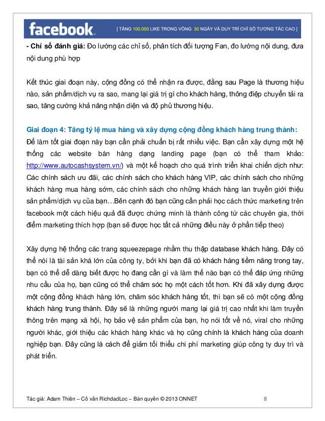 - 7. Tác giả: Adam Thiên – Cố vấn RichdadLoc – Bản quyền © 2013 ONNET 8 - Chỉ số đánh giá: Đo lường các chỉ số, phân tích đối tượng Fan, đo lường nội dung, đưa nội dung phù hợp Kết thúc giai đoạn này, cộng đồng có thể nhận ra được, đằng sau Page là thương hiệu nào, sản phẩm/dịch vụ ra sao, mang lại giá trị gì cho khách hàng, thông điệp chuyển tải ra sao, tăng cường khả năng nhận diện và độ phủ thương hiệu. Giai đoạn 4: Tăng tỷ lệ mua hàng và xây dựng cộng đồng khách hàng trung thành: Để làm tốt giai đoạn này bạn cần phải chuẩn bị rất nhiều việc. Bạn cần xây dựng một hệ thống các website bán hàng dạng landing page (bạn có thể tham khảo: http://www.autocashsystem.vn/) và một kế hoạch cho quá trình triển khai chiến dịch như: Các chính sách ưu đãi, các chính sách cho khách hàng VIP, các chính sách cho những khách hàng mua hàng sớm, các chính sách cho những khách hàng lan truyền giới thiệu sản phẩm/dịch vụ của bạn…Bên cạnh đó bạn cũng cần phải học cách thức marketing trên facebook một cách hiệu quả đã được chứng minh là thành công từ các chuyên gia, thời điểm marketing thích hợp (bạn sẽ được học tất cả những điều này ở phần tiếp theo) Xây dựng hệ thống các trang squeezepage nhằm thu thập database khách hàng. Đây có thể nói là tài sản khá lớn của công ty, bởi khi bạn đã có khách hàng tiềm năng trong tay, bạn có thể dễ dàng biết được họ đang cần gì và làm thế nào bạn có thể đáp ứng những nhu cầu của họ, bạn cũng có thể chăm sóc họ một cách tốt hơn. Khi đã xây dựng được một cộng đồng khách hàng lớn, chăm sóc khách hàng tốt, thì bạn sẽ có một cộng đồng khách hàng trung thành. Đây sẽ là những người mang lại giá trị cao nhất khi làm truyền thông trên mạng xã hội, họ bảo vệ sản phẩm của bạn, họ nói tốt về nó, viral cho những người khác, giới thiệu các khách hàng khác và họ cũng chính là khách hàng của doanh nghiệp bạn. Đây cũng là cách để giảm tối thiểu chi phí marketing giúp công ty duy trì và phát triển.