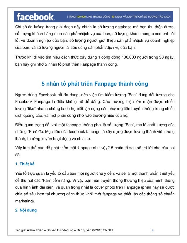 - 8. Tác giả: Adam Thiên – Cố vấn RichdadLoc – Bản quyền © 2013 ONNET 9 Chỉ số đo lường trong giai đoạn này chính là số lượng database mà bạn thu thập được, số lượng khách hàng mua sản phẩm/dịch vụ của bạn, số lượng khách hàng comment nói tốt về doanh nghiệp của bạn, số lượng người giới thiệu sản phẩm/dịch vụ doanh nghiệp của bạn, và số lượng người tái tiêu dùng sản phẩm/dịch vụ của bạn. Trước khi đi vào tìm hiểu cách thức xây dựng 1 cộng đồng 100.000 người trong 30 ngày, bạn hãy ghi nhớ 5 nhân tố phát triển Fanpage thành công. 5 nhân tố phát triển Fanpage thành công Người dùng Facebook rất đa dạng, nên việc tìm kiếm lượng “Fan” đúng đối tượng cho Facebook Fanpage là điều không hề dễ dàng. Các thương hiệu lớn nhận được nhiều lượng “like” nhanh chóng là do họ biết tận dụng các phương tiện truyền thông trong chiến dịch quảng cáo, và một phần cũng nhờ vào thương hiệu của họ. Điều quan trọng đối với một fanpage không phải là số lượng “Fan”, mà là chất lượng của những “Fan” đó. Mục tiêu của facebook fanpage là xây dựng được lượng thành viên trung thành, thường xuyên hoạt động và chia sẻ. Vậy làm thế nào để phát triển một fanpage như vậy? 5 nhân tố sau sẽ trả lời cho câu hỏi đó. 1. Thiết kế Yếu tố trực quan là yếu tố đầu tiên mọi người chú ý đến, và sẽ là một thành phần thiết yếu để thu hút các “Fan” tiềm năng. Vì vậy bạn nên truyền thông thương hiệu của mình thông qua hình ảnh đại diện, và quan trọng nhất là cover photo trên Fanpage (phần này sẽ được chia sẻ sâu hơn tại chương cách thức khởi một fanpage và thiết lập các thông số chuẩn marketing). 2. Nội dung